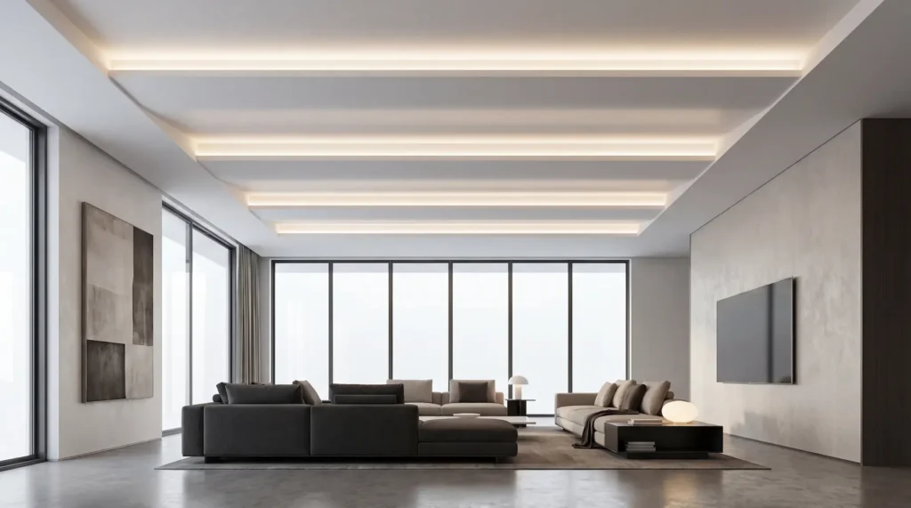یکی از پرکاربردترین زیرشاخههای این ترند، لاین نوری سقفی است. این لاینها میتوانند به صورت توکار (همسطح با سقف)، روکار یا آویز استفاده شوند و به عنوان نور عمومی یا نورپردازی محیطی (Ambient) عمل میکنند و نور یکنواخت و بدون خیرگی را در محیط پخش میکنند.
